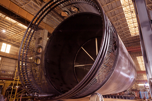 公司承制的余熱排出系統(tǒng)水冷壁設備系高溫氣冷堆核電站中第一大件,為國內乃至國際首臺,也即將成為高溫氣冷堆示范工程第一個到貨的超大件。余熱排出系統(tǒng)水冷壁主要用于吸收反應堆壓力容器表面釋放的熱量,并通過水冷壁內的冷卻水將熱量帶出反應堆艙室,保證反應堆壓力容器與混凝土艙室溫度不超過規(guī)定限值。整個水冷壁包括水冷膜式壁、外支撐圈、隔熱板、冷卻水管、聯(lián)箱、出入口主管、錐形支撐底座等,其安裝方式為環(huán)繞反應堆壓力容器垂直放置。該設備外形尺寸φ8726×19096mm,尺寸大、運輸超限、安裝間隙小、精度要求高,對制造成形、組裝、焊接、無損檢測、水壓試驗、氣壓試驗及搬運吊裝運輸都帶來了很大困難。尤其是制造尺寸超限,設備整體組裝只能在江邊碼頭進行,寒冬臘月,江風刺骨;冷冽的寒風中,項目制造管理團隊始終保持飽滿的工作熱情,面對困難迎難而上,攻堅克難。針對本設備結構的特殊性,結合現(xiàn)有設備、工藝裝配、檢測手段、質量管理要求設計了專用的水冷壁內外支撐工裝、分片膜式壁吊運工裝、水冷壁整體運輸工裝、水冷壁整體垂直吊裝工裝等,編制了完整的操作規(guī)程、工藝執(zhí)行文件、質量計劃、焊接工藝、檢驗方案等,為產品質量提供了有力的支撐和保證。最終,產品制造質量獲得了業(yè)主和設計院的一致好評,順利通過驗收。