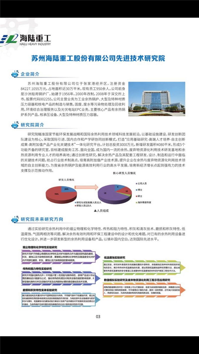 海陸重工一直秉承“科技領(lǐng)航,業(yè)界先鋒”的經(jīng)營理念,專注于流程工藝中余熱、廢熱回收與環(huán)保技術(shù)相結(jié)合的技術(shù)研發(fā),主營業(yè)務(wù)為主工業(yè)余熱鍋爐、大型及特種材質(zhì)壓力容器和核電產(chǎn)品的制造與銷售,固廢、廢水等污染物處理及回收利用,環(huán)境綜合治理服務(wù)以及光伏電站EPC業(yè)務(wù)。本公司先進(jìn)技術(shù)研究院瞄準(zhǔn)國家節(jié)能環(huán)保發(fā)展戰(zhàn)略和國際節(jié)能環(huán)保技術(shù)領(lǐng)域科技發(fā)展前沿,以基礎(chǔ)設(shè)施建設(shè)、研發(fā)創(chuàng)新團(tuán)隊建設(shè)為核心,采取國際引進(jìn)、國內(nèi)合作和產(chǎn)學(xué)研協(xié)同創(chuàng)新模式,打造“應(yīng)用基礎(chǔ)研究-高端人才培養(yǎng)-自主創(chuàng)新成果-高附加值產(chǎn)品產(chǎn)業(yè)化關(guān)鍵技術(shù)”一體化研究平臺。