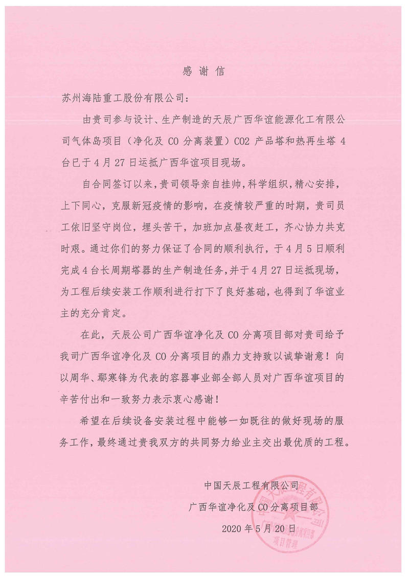 編后語(yǔ):收到客戶的感謝信,我們的心中十分的激動(dòng),但小編還是要向每一位尊貴的客戶說(shuō)一句:“這是我們應(yīng)該做的,謝謝你們這么多年對(duì)我們海陸的關(guān)心和支持,我們海陸一定會(huì)做的更好?!?br /> 海陸重工作為國(guó)內(nèi)一流的節(jié)能環(huán)保設(shè)備專業(yè)設(shè)計(jì)制造企業(yè),產(chǎn)品覆蓋鍋爐、壓力容器、核電、冶金及環(huán)保工程等多個(gè)產(chǎn)品領(lǐng)域,秉承“科技領(lǐng)航 業(yè)界先鋒”的理念,順應(yīng)時(shí)代發(fā)展,致力于為實(shí)現(xiàn)國(guó)家節(jié)能環(huán)保的戰(zhàn)略目標(biāo)做出更大貢獻(xiàn)。